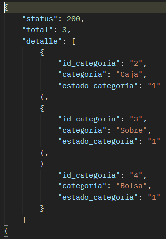 El resultado de la consulta de todos los categorias debería ser como se muestra en la siguiente imagen: