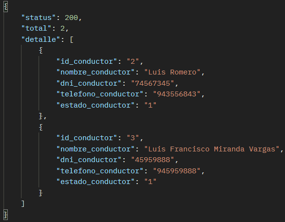 El resultado de la consulta de todos los conductores debería ser como se muestra en la siguiente imagen: